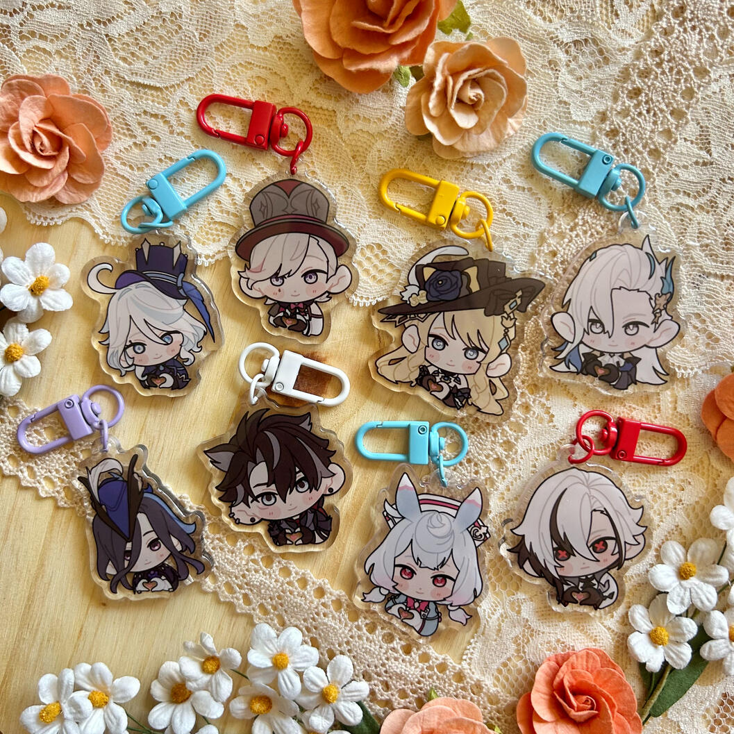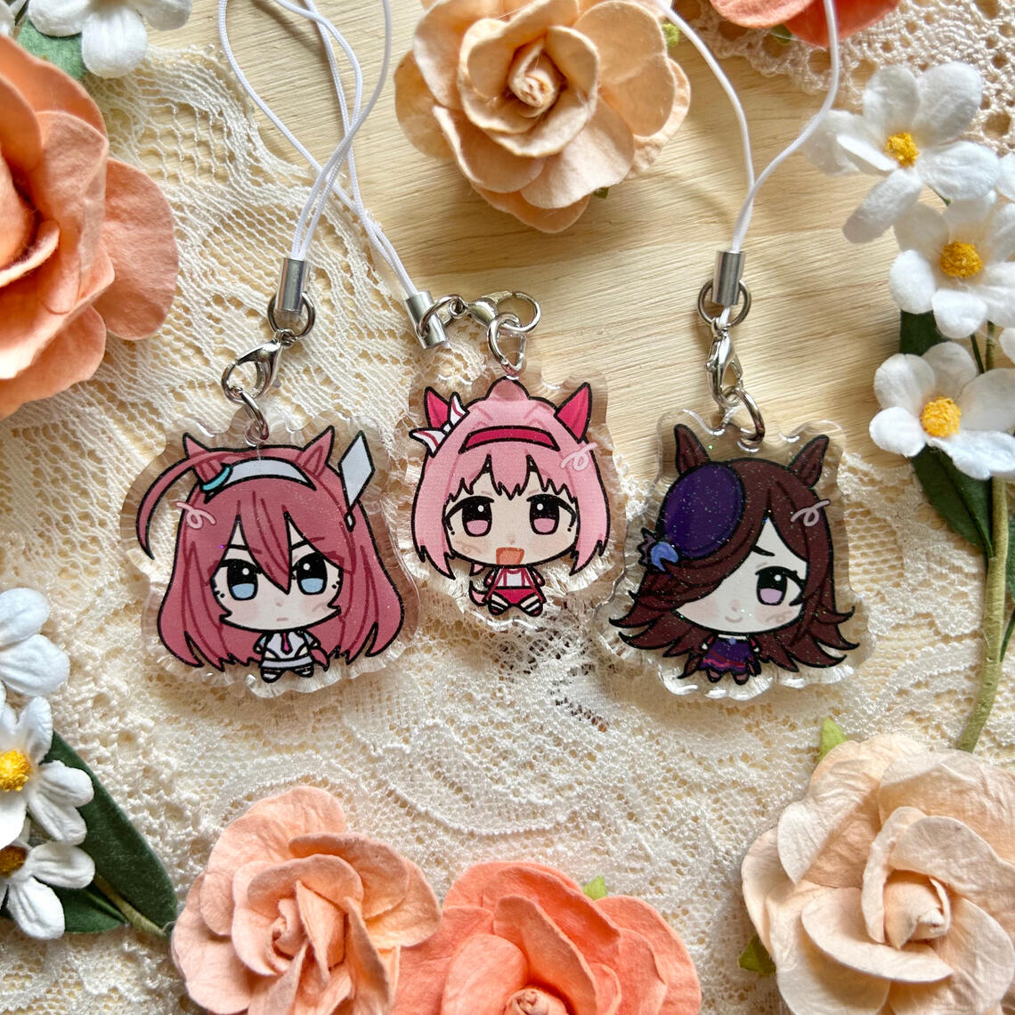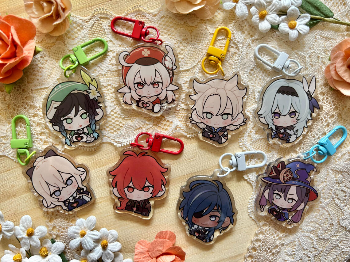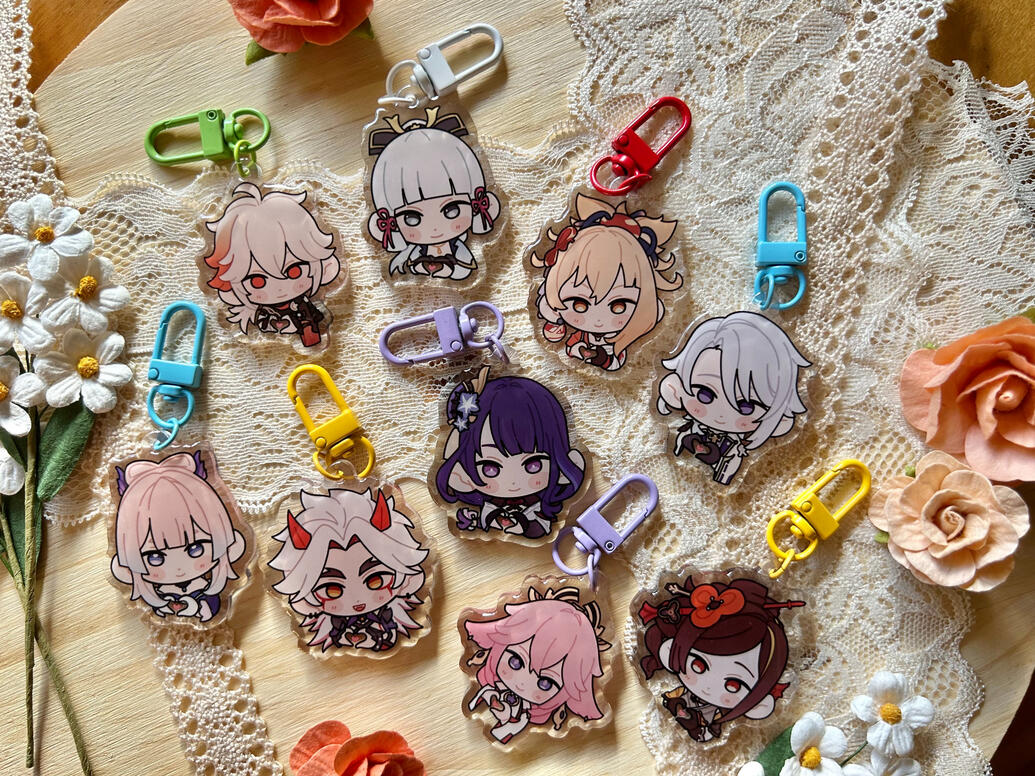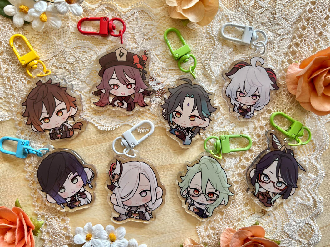 A variety of charms/keychains made from 2024 to 2025, ranging in sizes from 1.5 inches to 2 inches in height. Some featured series are Twisted Wonderland, Gachiakuta, Uma Musume, Genshin Impact, and My Little Pony.