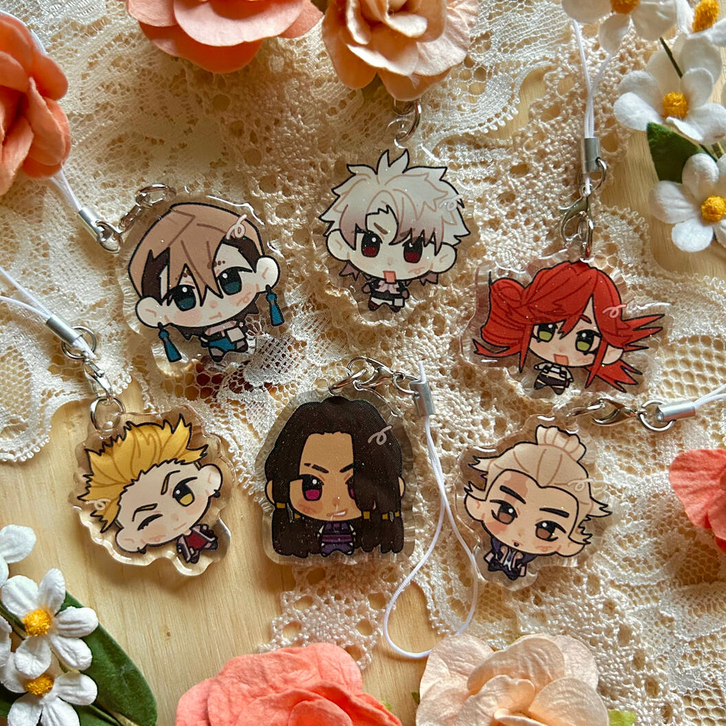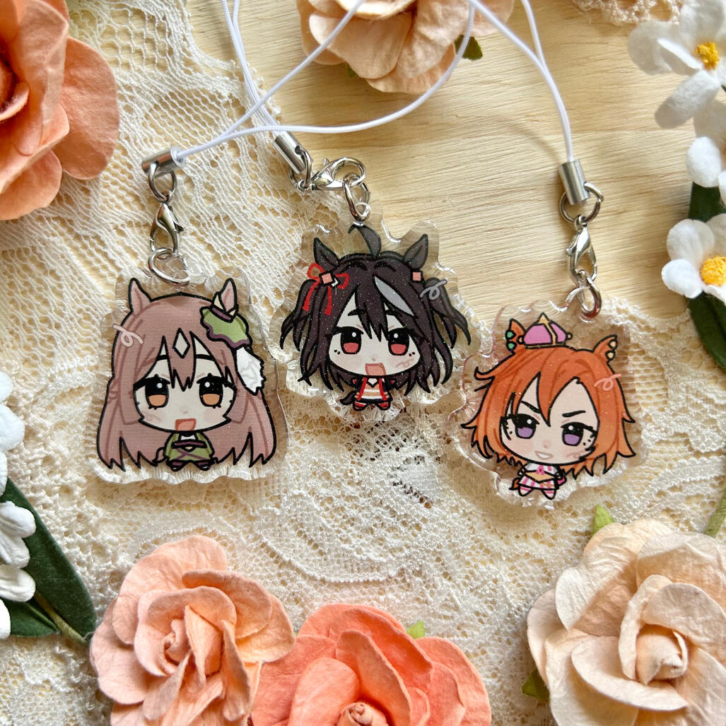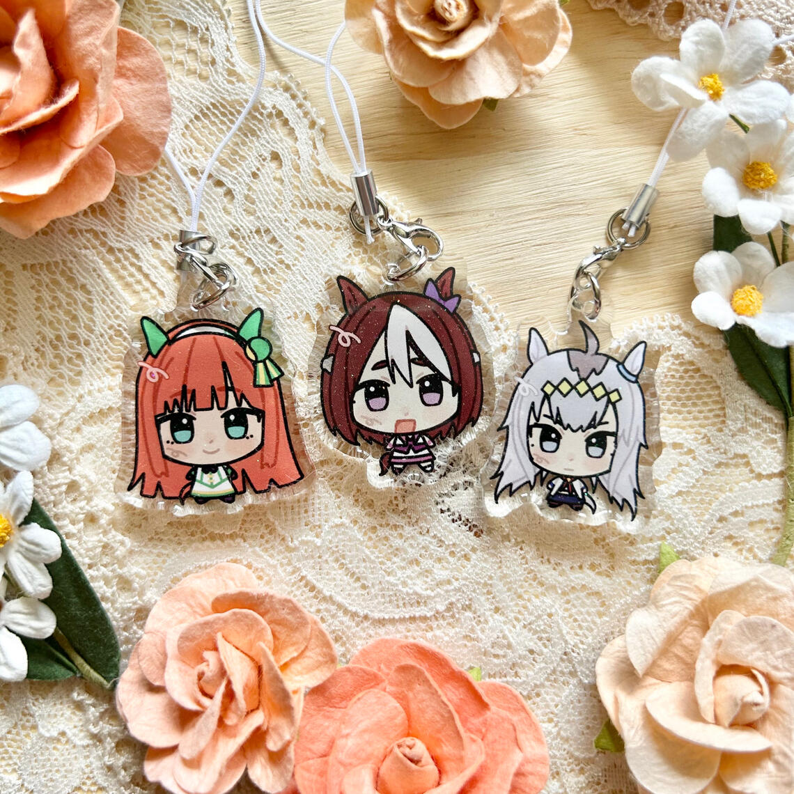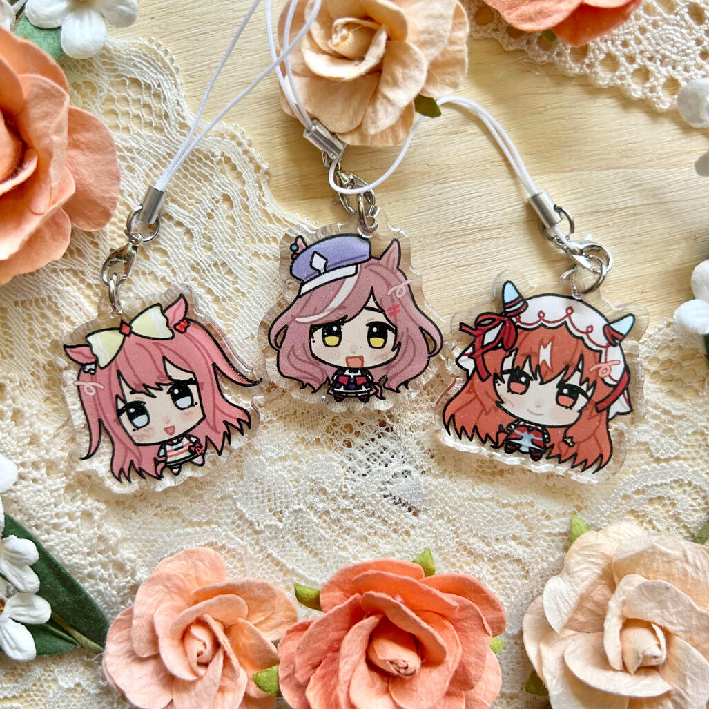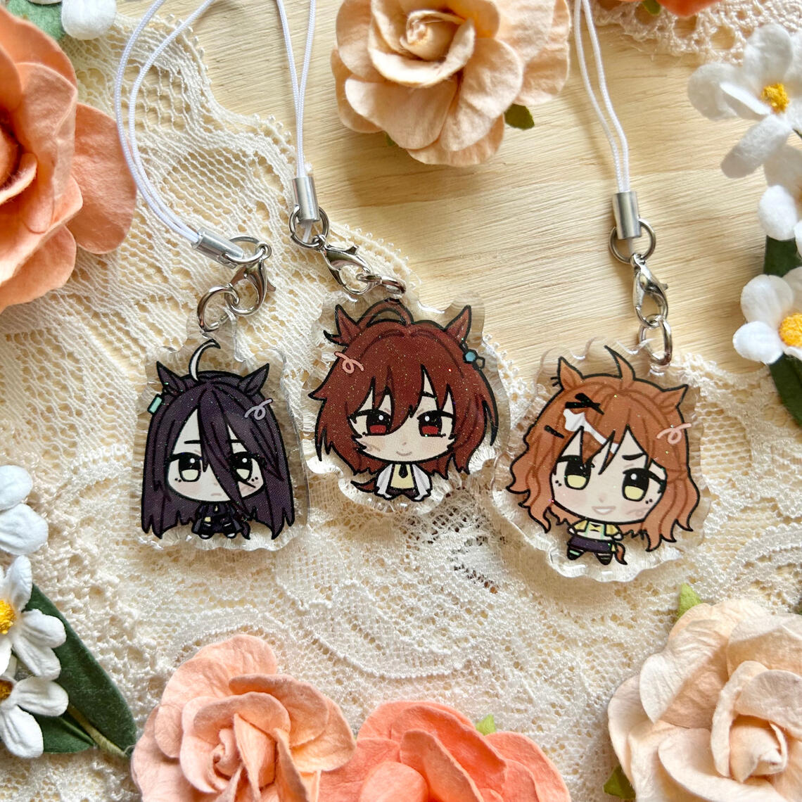 A variety of charms/keychains made from 2024 to 2025, ranging in sizes from 1.5 inches to 2 inches in height. Some featured series are Twisted Wonderland, Gachiakuta, Uma Musume, Genshin Impact, and My Little Pony.