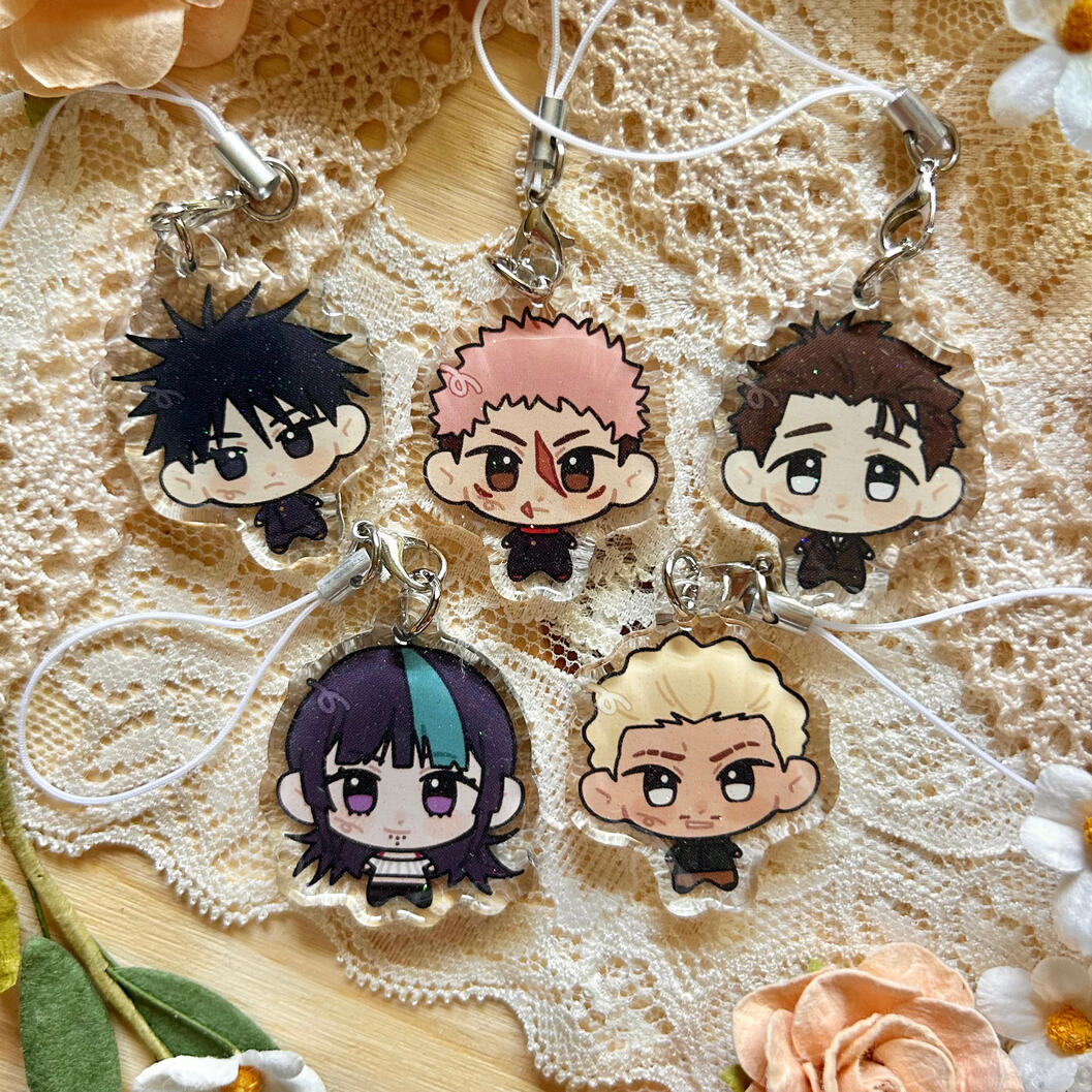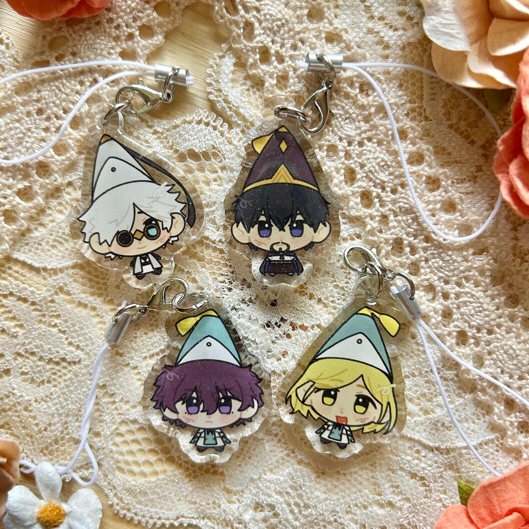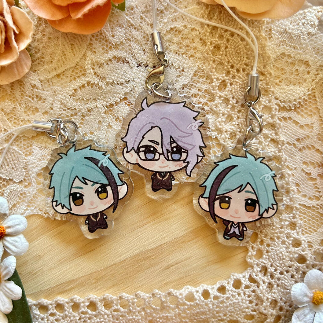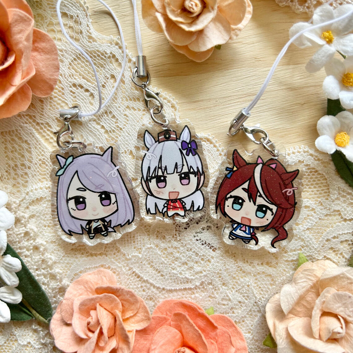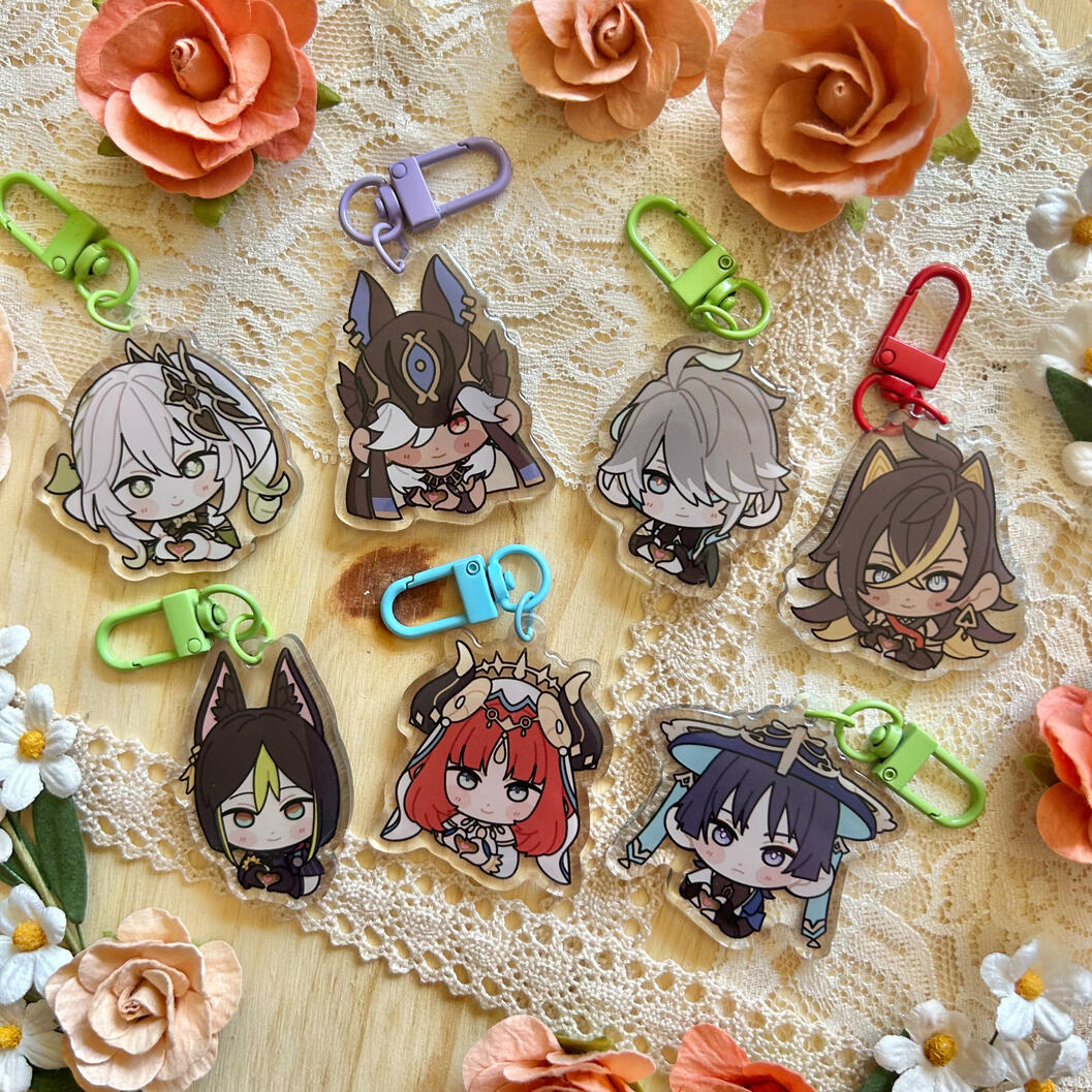 A variety of charms/keychains made from 2024 to 2025, ranging in sizes from 1.5 inches to 2 inches in height. Some featured series are Twisted Wonderland, Gachiakuta, Uma Musume, Genshin Impact, and My Little Pony.