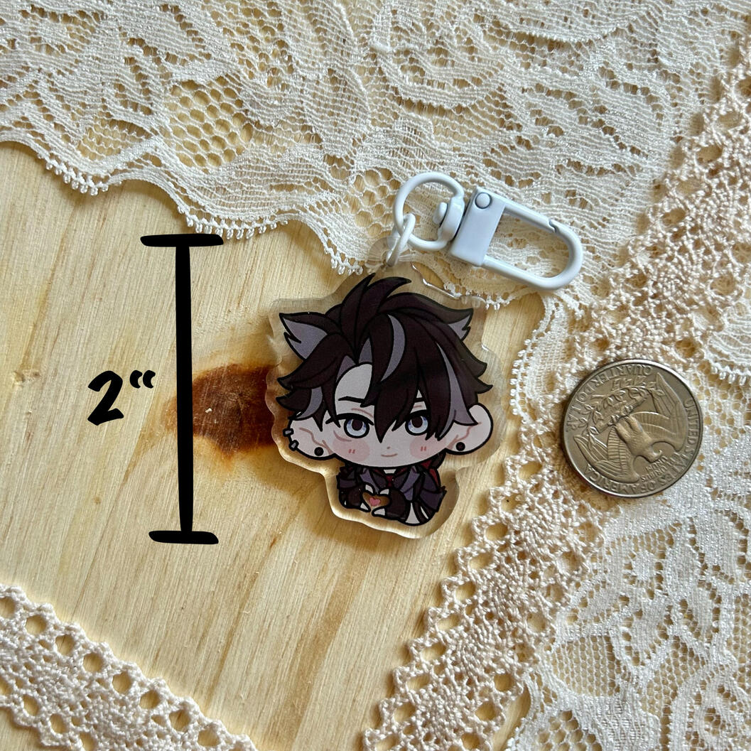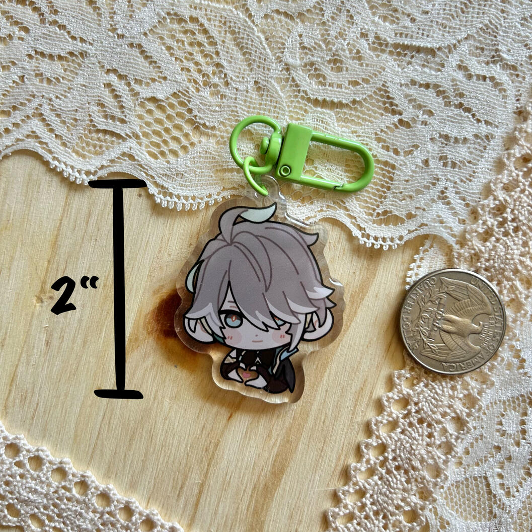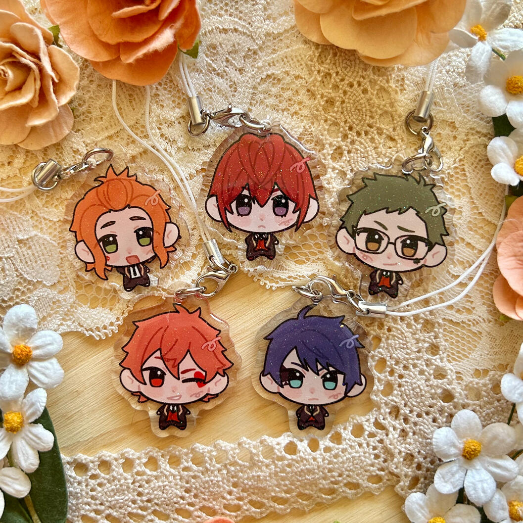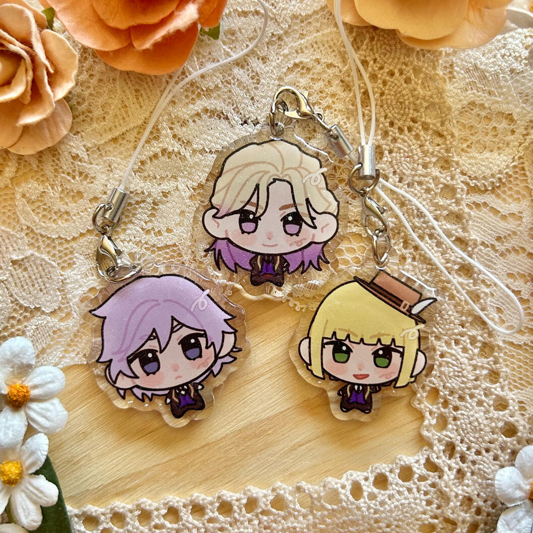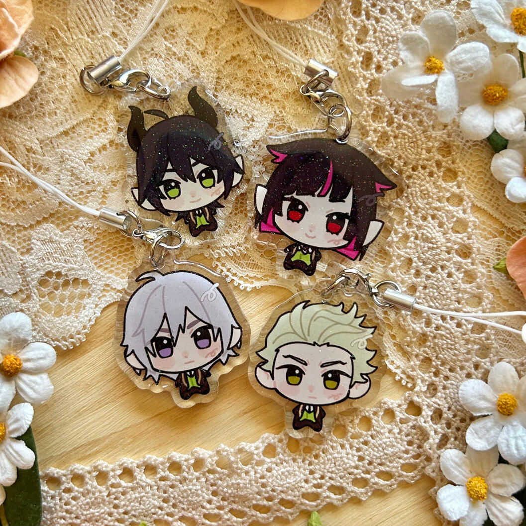 A variety of charms/keychains made from 2024 to 2025, ranging in sizes from 1.5 inches to 2 inches in height. Some featured series are Twisted Wonderland, Gachiakuta, Uma Musume, Genshin Impact, and My Little Pony.