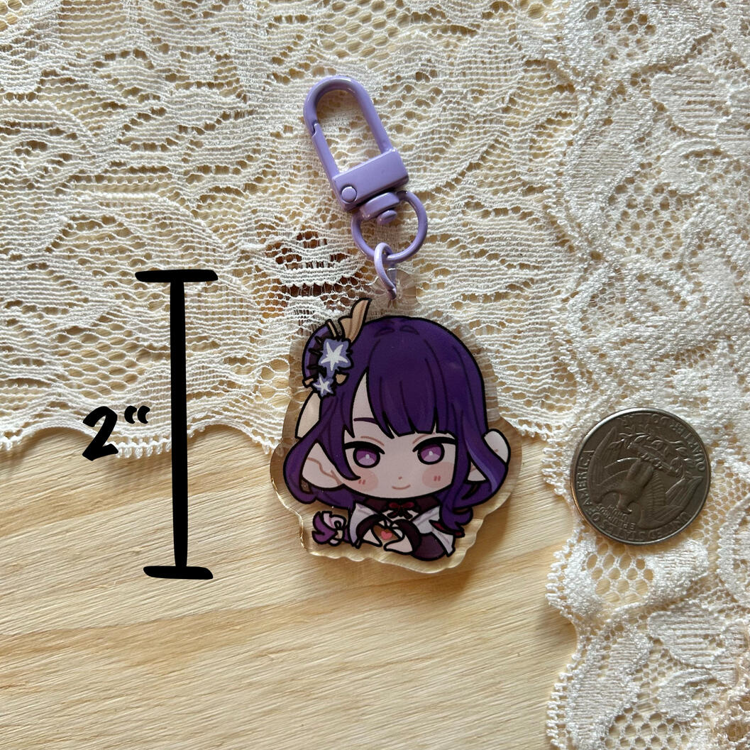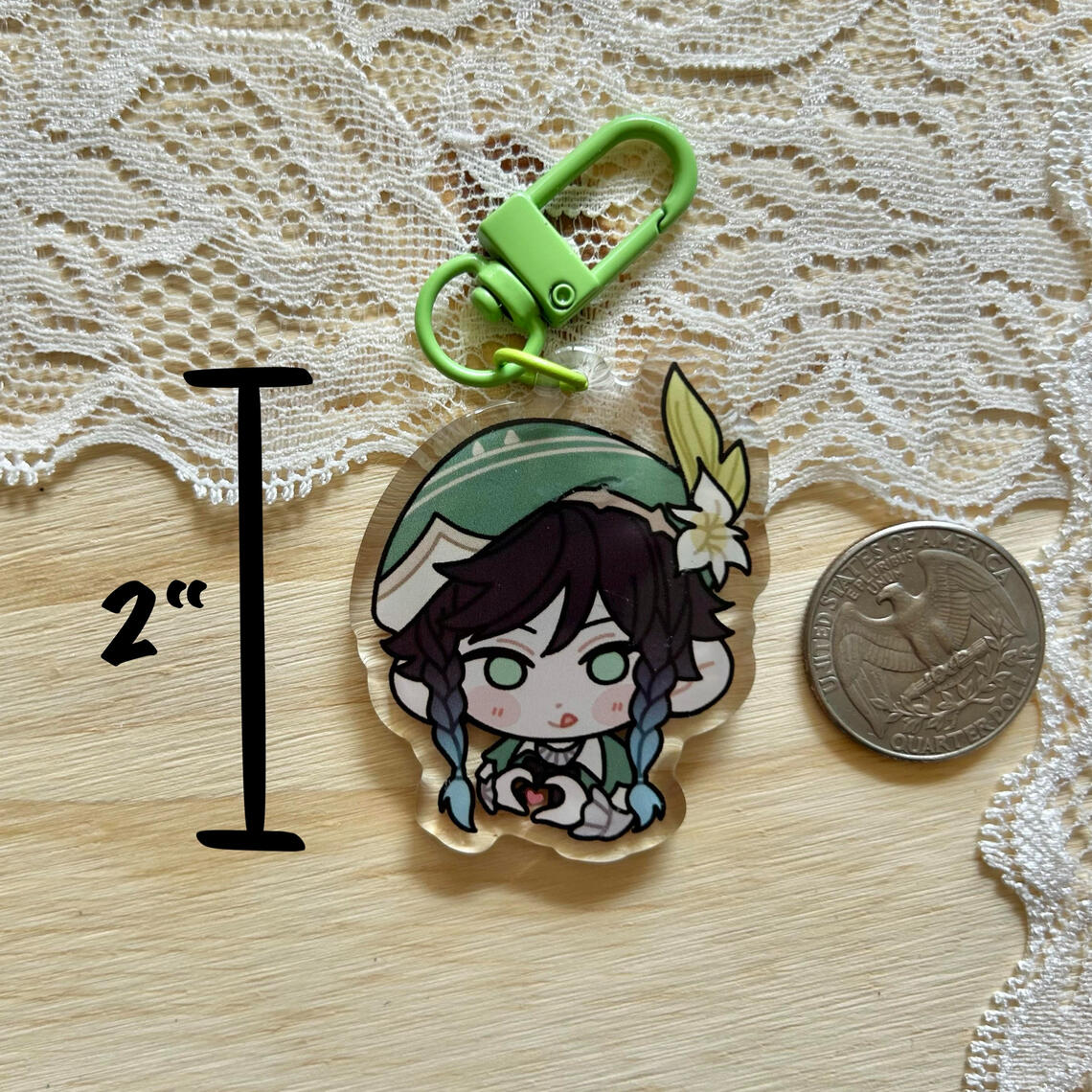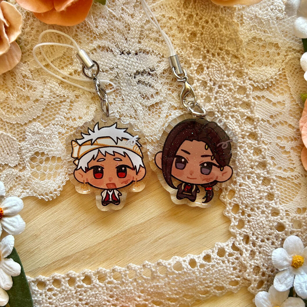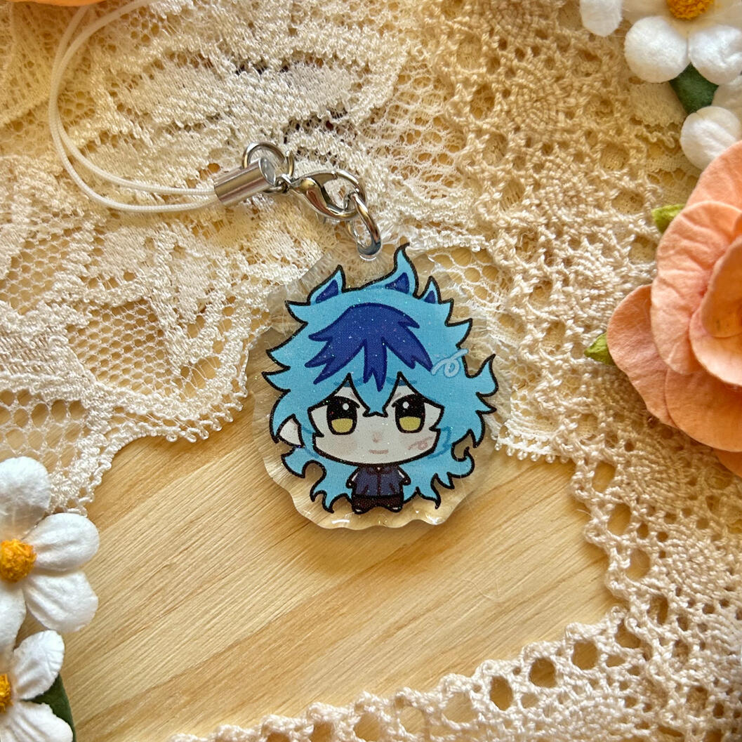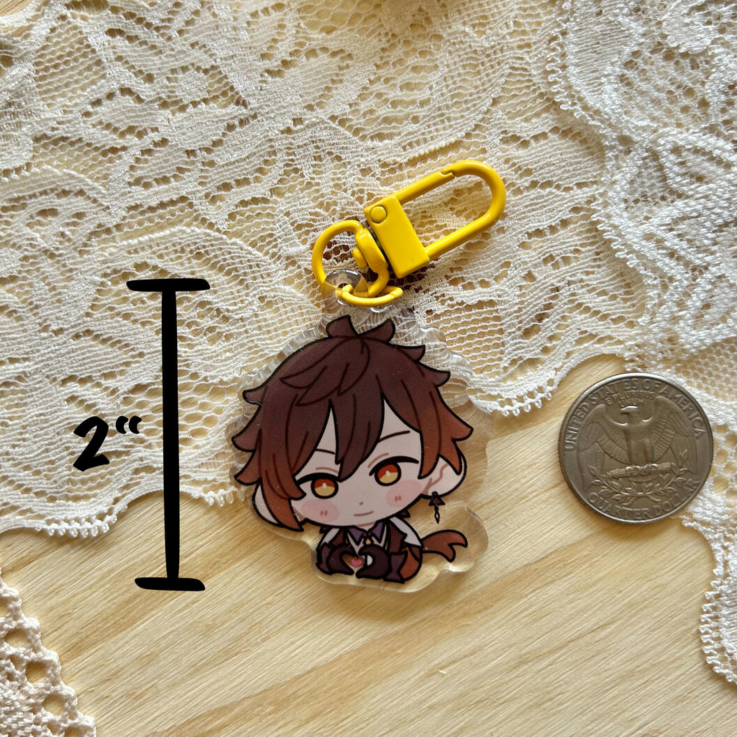 A variety of charms/keychains made from 2024 to 2025, ranging in sizes from 1.5 inches to 2 inches in height. Some featured series are Twisted Wonderland, Gachiakuta, Uma Musume, Genshin Impact, and My Little Pony.