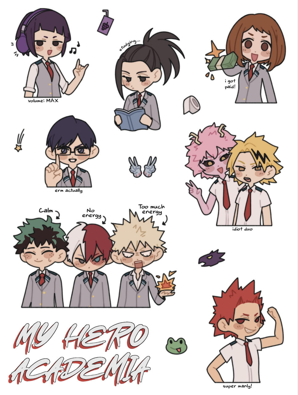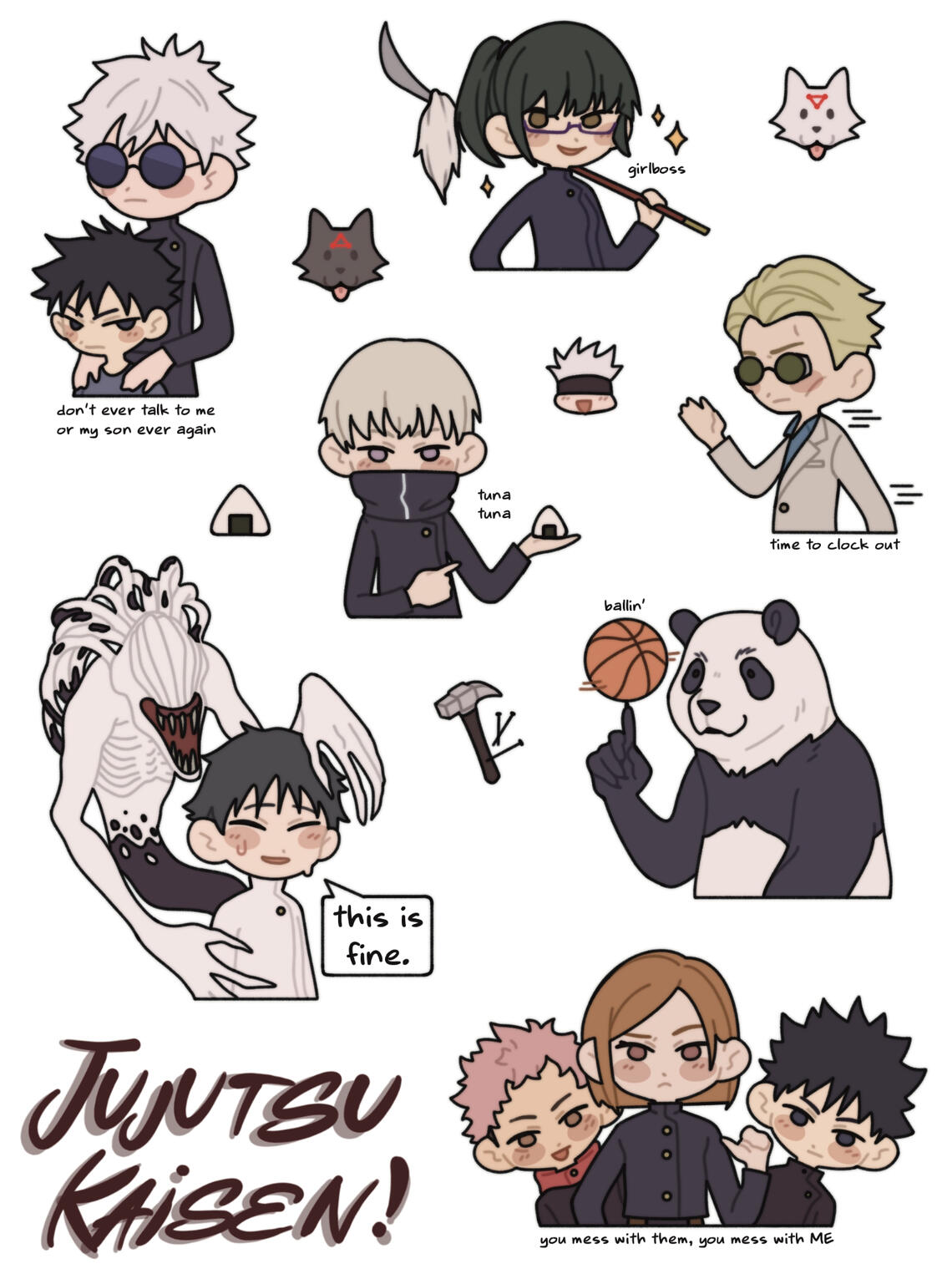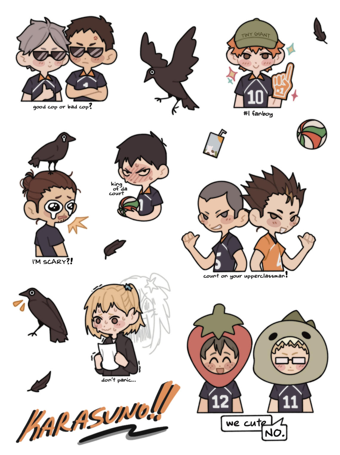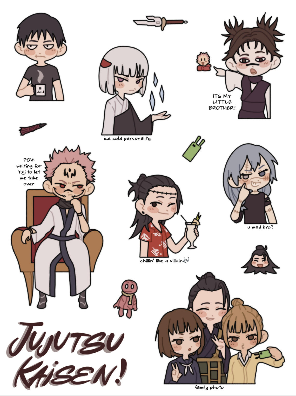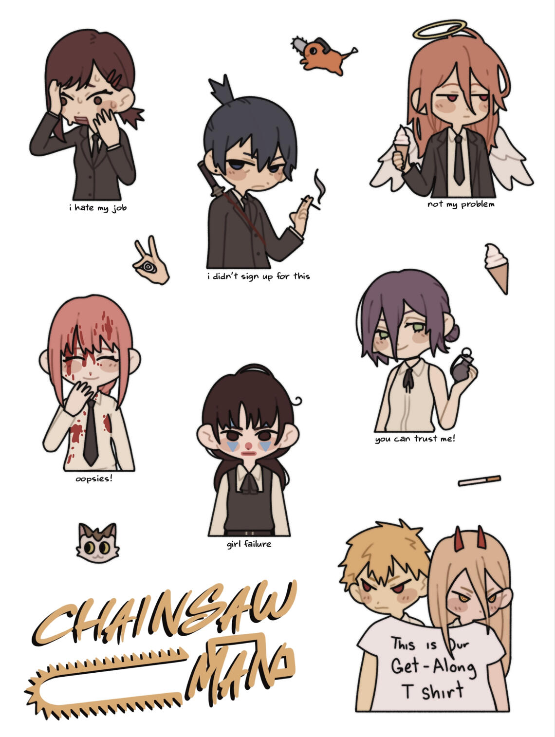 A variety of sticker sheets made from 2024 to 2025. Some featured series are Haikyuu, Chainsaw man, and Jujutsu Kaisen.