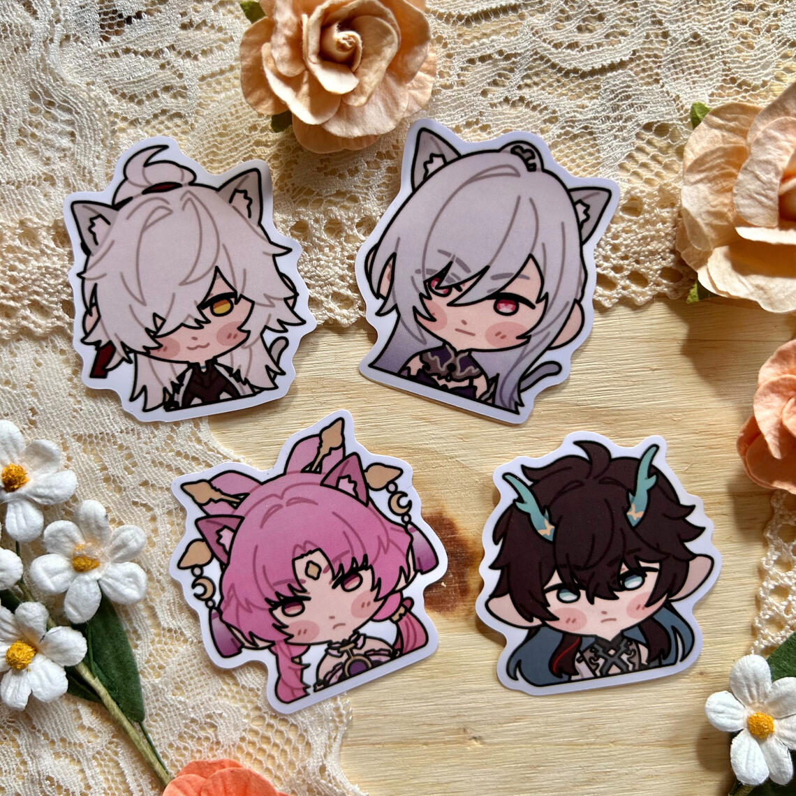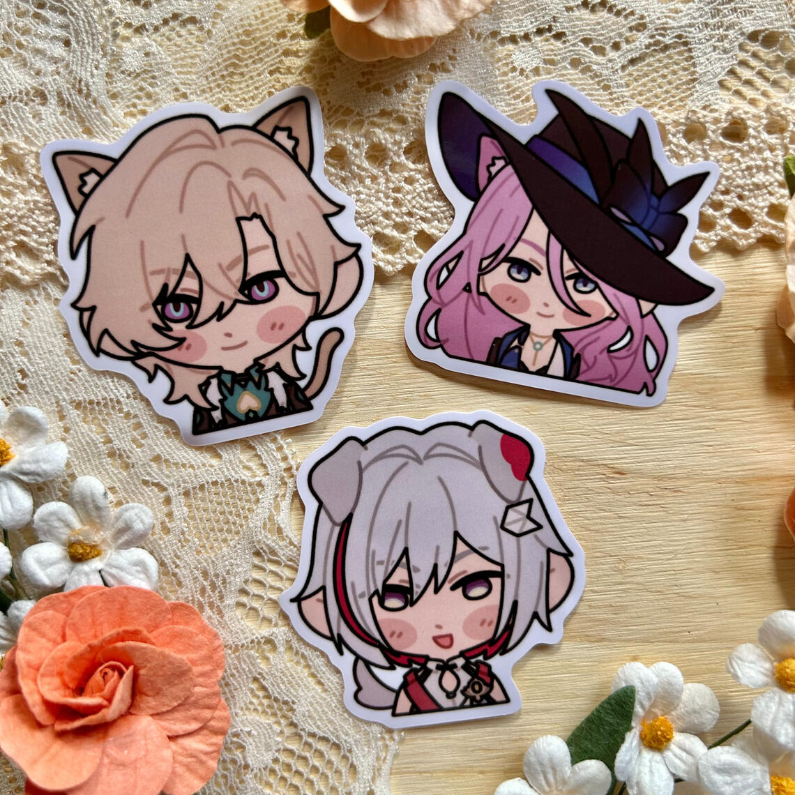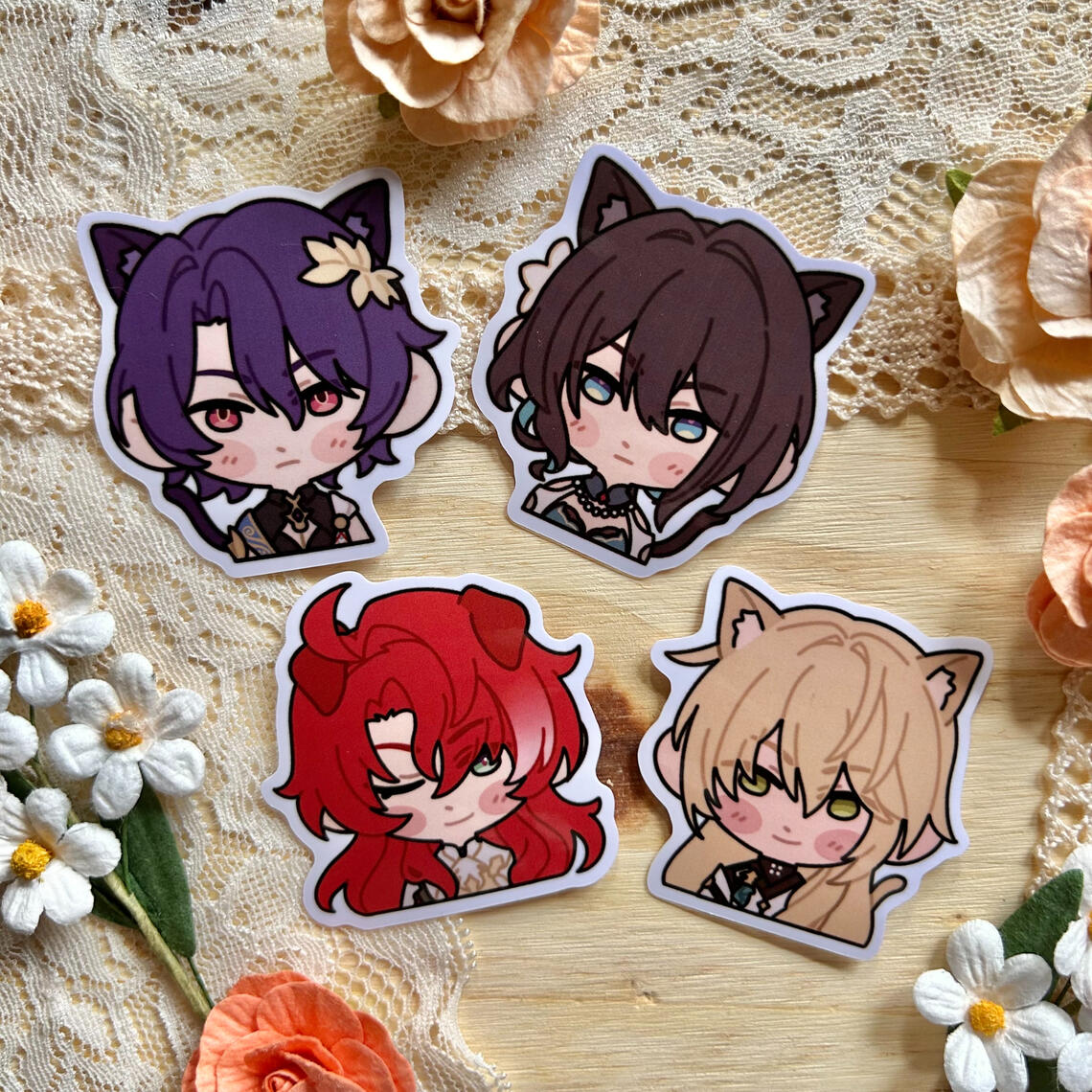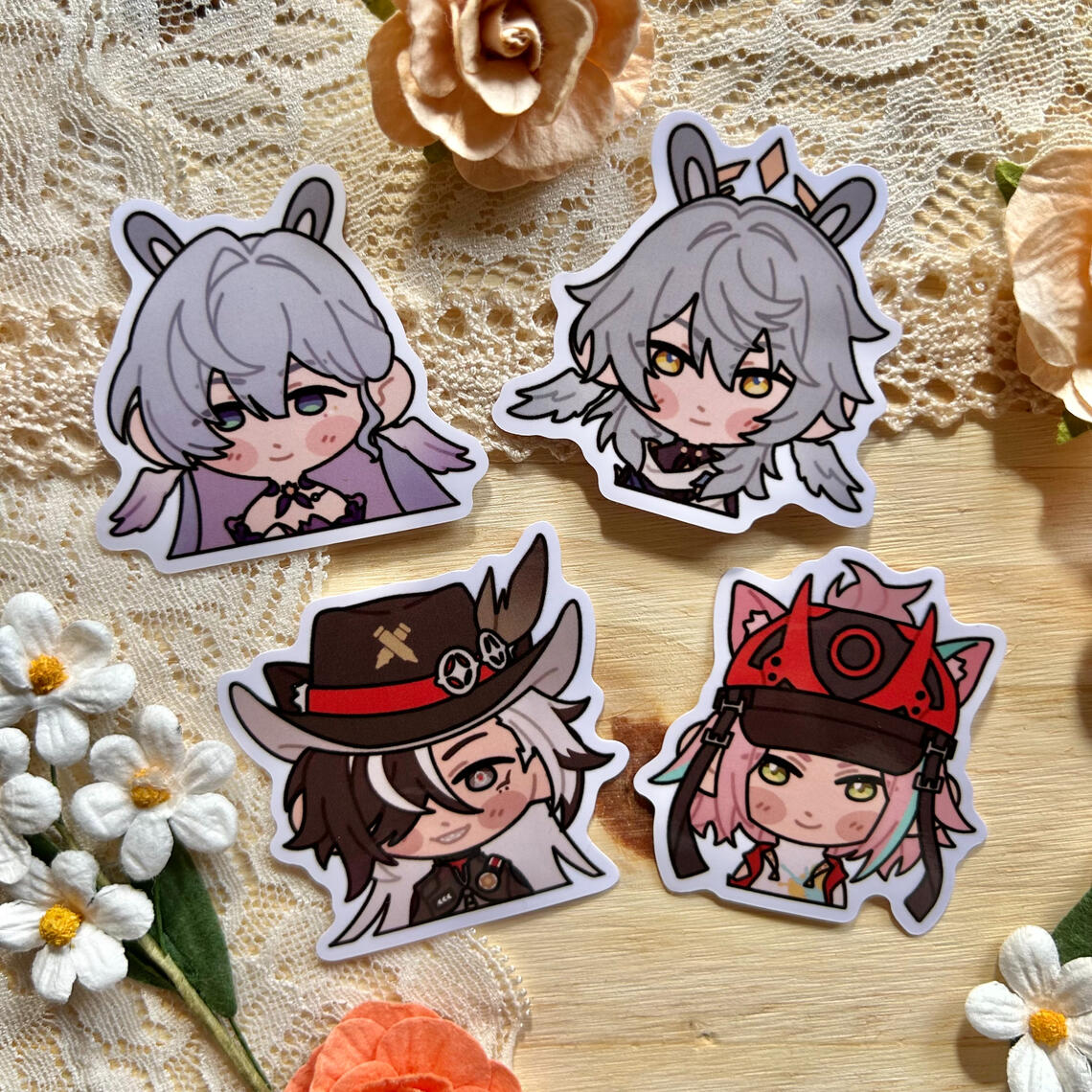 A variety of sticker sheets made from 2024 to 2025. Some featured series are Obey Me, Honkai Star Rail, and Haikyu.