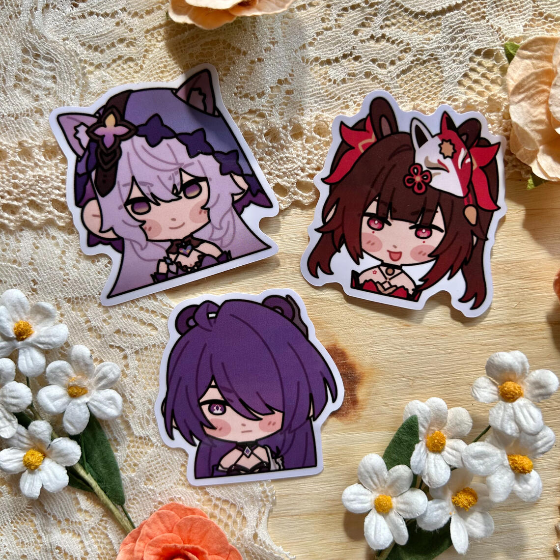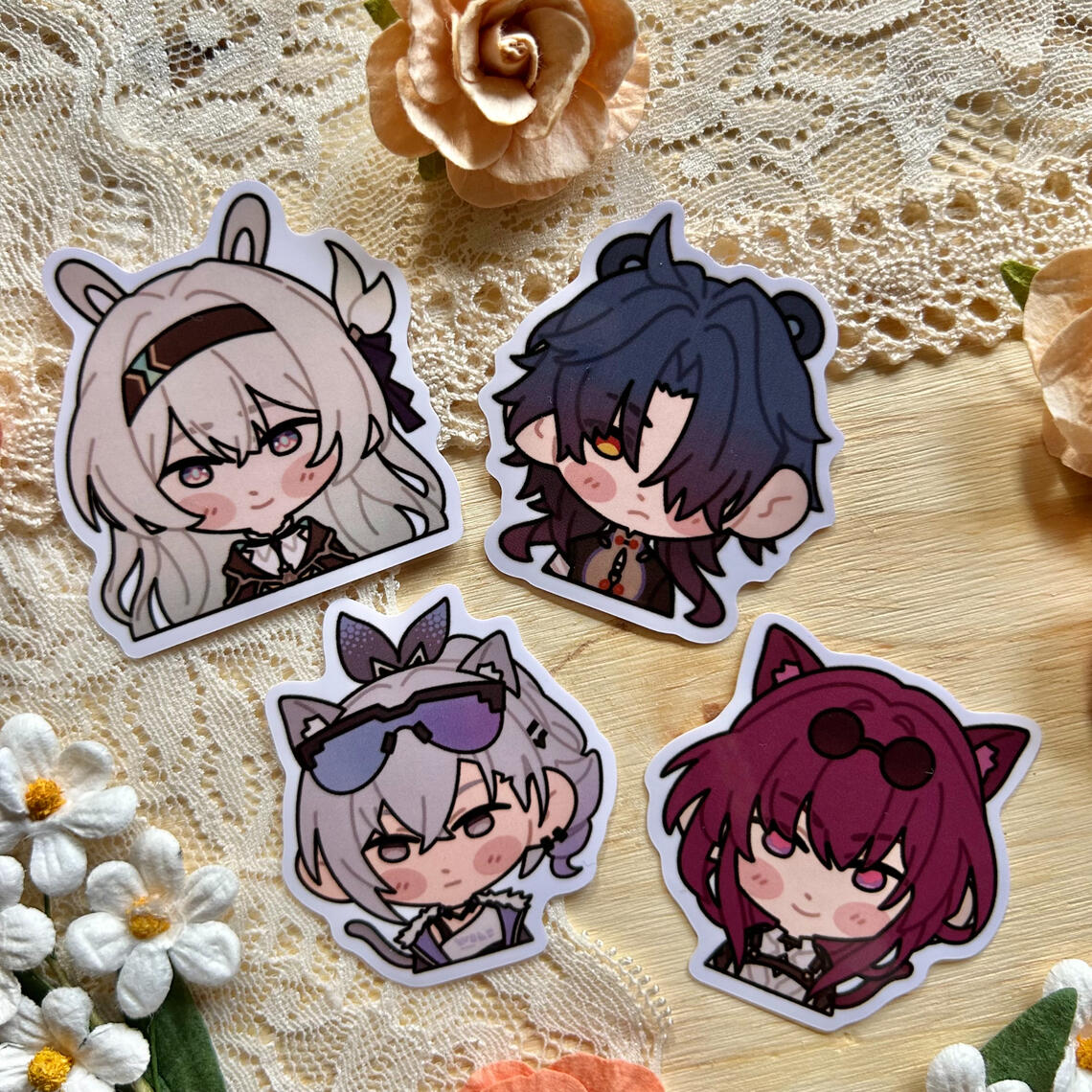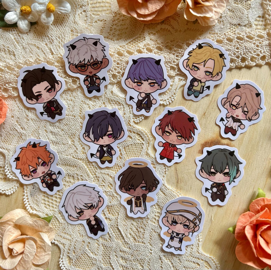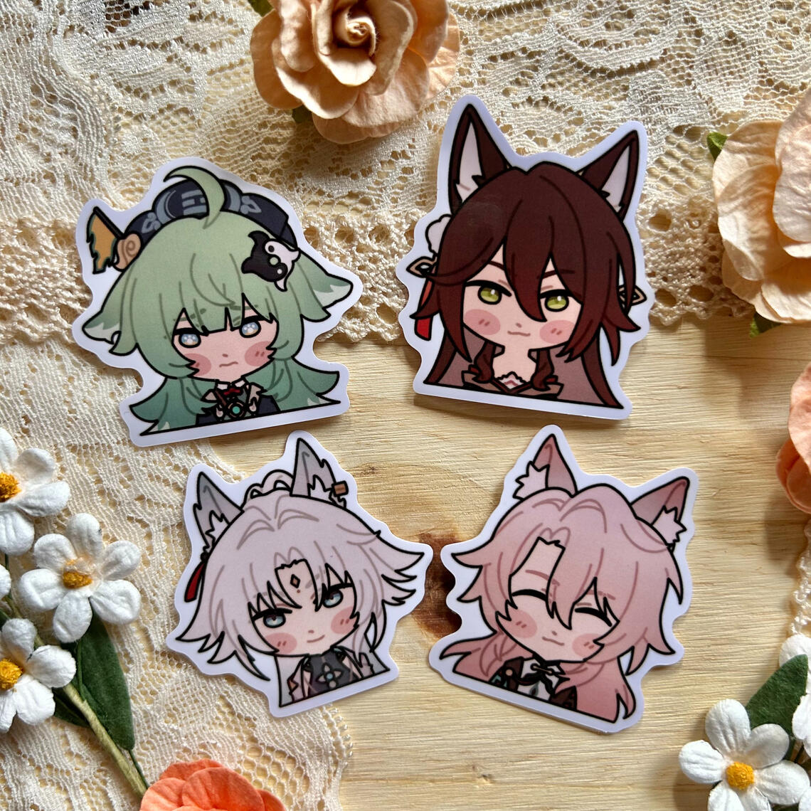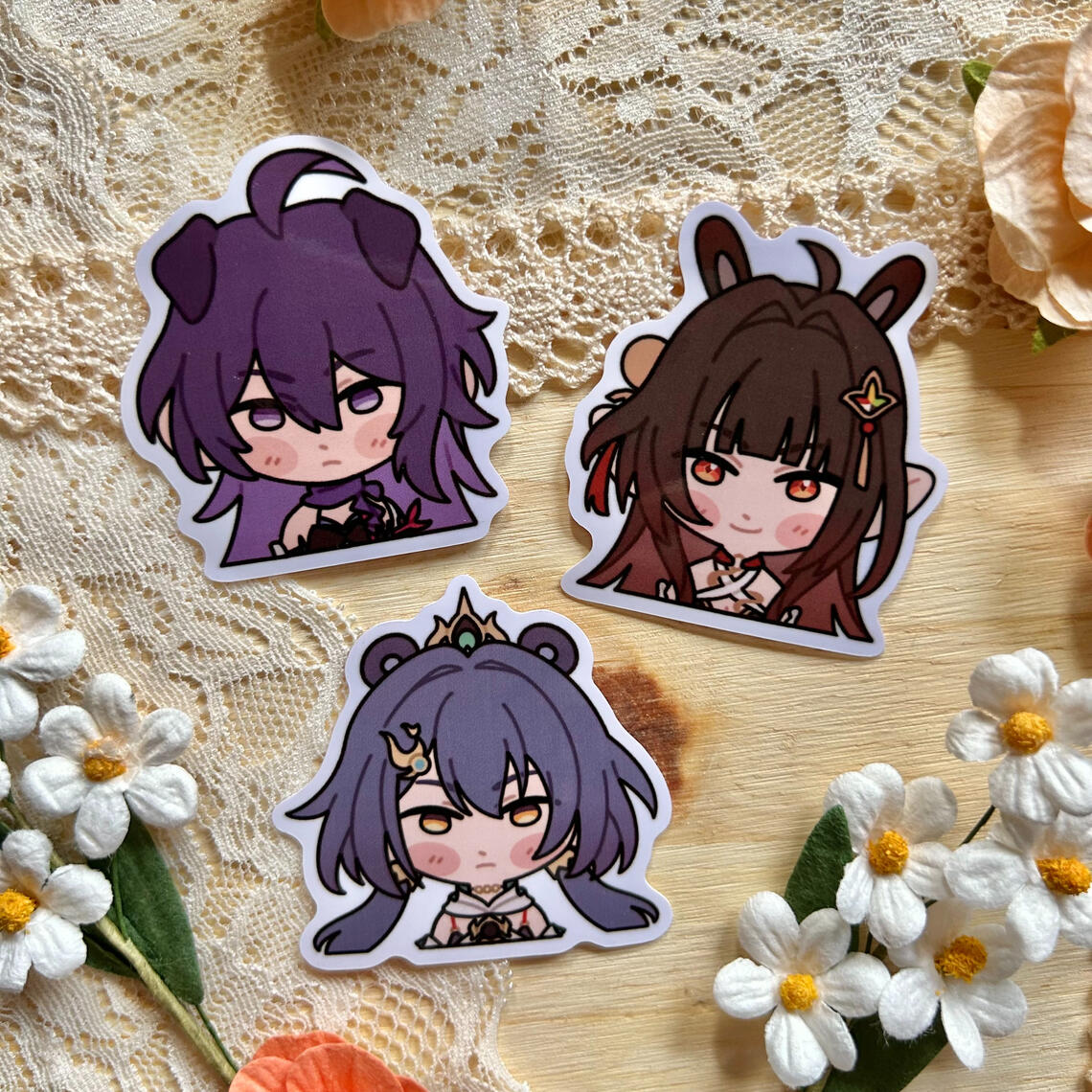 A variety of sticker sheets made from 2024 to 2025. Some featured series are Obey Me, Honkai Star Rail, and Haikyu.